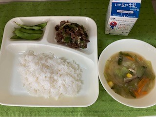 チンジャオニューロウスーは、ピーマンと牛肉を細く切っていためた中国料理です。給食では、牛肉とピーマン、たけのこをいため、砂糖やしょうゆ、オイスターソースなどで味付けしています。子どもたちに大人気の献立です。