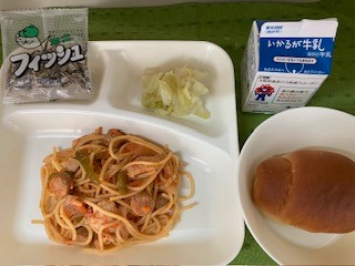 ●チキントマトスパゲティ ●キャベツのピクルス ●ミニフィッシュ ●ミニコッペパン ●牛乳