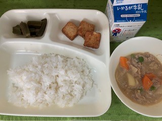 ●みそ肉じゃが ●あつあげのしょうがじょうゆかけ ●オクラのおかかいため ●ごはん ●牛乳