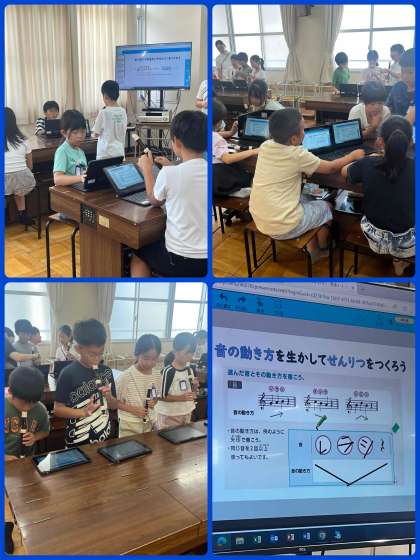 「音の動き方を生かしてせんりつをつくろう」という学習めあてで、友だちと協力して旋律づくりに挑戦しました。まず各自で、「ソラシドレ」の5音の中から3音を選んで1小節分の音をつくり、その後友だちがつくった小節を合わせて旋律をつくりました。「最後が終わる感じになるにはどう並べたらいいかな?」「この並びだとまだ曲が続きそう!」などと話し合いながら、一番いい感じになる並べ方を子どもたちは一生懸命に考えていました。