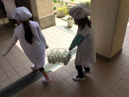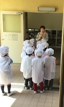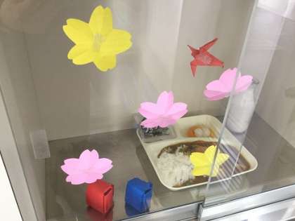 給食室の中には、配膳の例がガラスケースの中にあります。