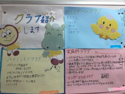 階段の踊り場の掲示板。 ***** クラブ紹介 *****