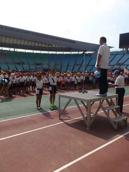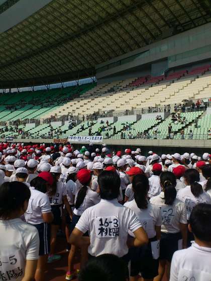 真夏の太陽が照りつける中、ヤンマースタジアム長居にて、第16回大阪市小学生スポーツ交流大会が行われます。開会式では大阪市の小学生を代表して、本校の6年生2名が選手宣誓を行いました。スタジアム全体に大きな声が響きわたり、とても感動しました。
