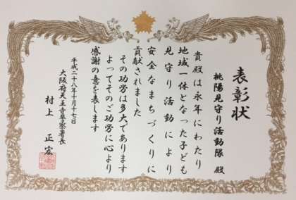 大阪府天王寺警察署から桃陽見守り活動にたいして、その取り組みが高く評価され昨年に引き続き表彰されました。