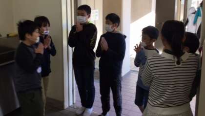 給食委員は、みんなに給食を配り終わり、給食室を出るときに「ありがとうございました。いただきます」と言います。