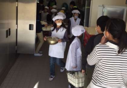 給食の食缶や牛乳などを、給食委員の係から受け取るときに