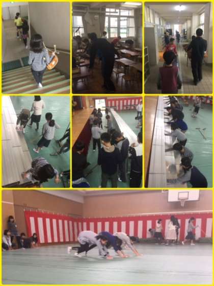 6年生は、一年生教室に机を運んだり、開場の体育館の掃除をしたりしました。