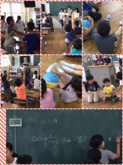 2時間目に実施しました。 たてわり班グループでの活動です。 写真下:絵しりとり。
