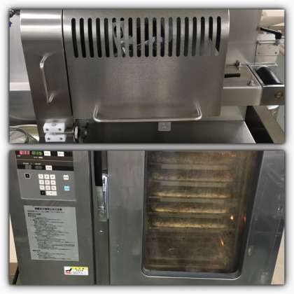 写真上はフードスライサーと言い大量の野菜を切るのに使用します。写真下は焼き物機と言って家庭でのオーブンと同じ役割を果たします。オーブンが導入されたことにより焼き物、蒸し物など多様な献立ができるようになりました。