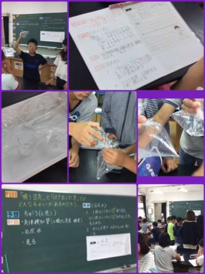 石灰水の入ったビニール袋に、「吸う空気」と「はきだした息」を入れ、