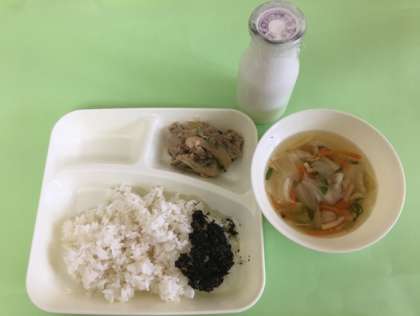 今日の給食は豚肉のごまみそ焼き、すまし汁、のりのつくだ煮です。他都市ではのりのつくだ煮ペーストを使用しているところもありますが大阪市ではかつおぶし、しいたけ、きざみのりを甘辛く煮詰め手作りしているんですよ。