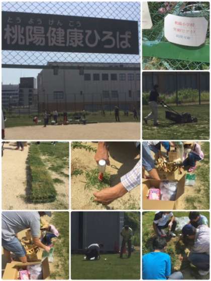 地域の皆さん、PTAの皆さん、子どもたちで「桃陽健康ひろば」の芝生の整備、雑草取りなどをしました。