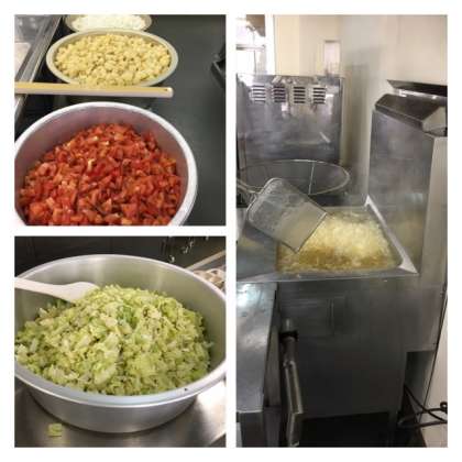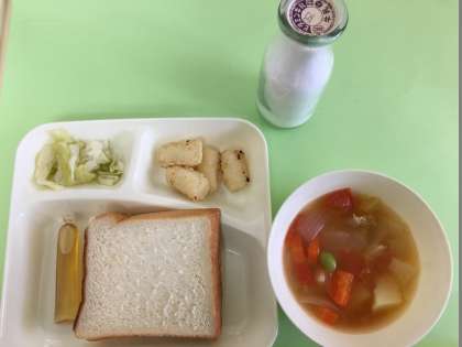 今日の給食は角切りにした一口サイズのいかてんぷらと鶏肉、じゃがいも、玉ねぎ、にんじん、むき枝豆を使い、生のトマトの酸味がさわやかな酸味のあるフレッシュトマトのスープ煮です。これにキャベツのピクルスがつきます。野菜がたっぷり摂れる献立です。