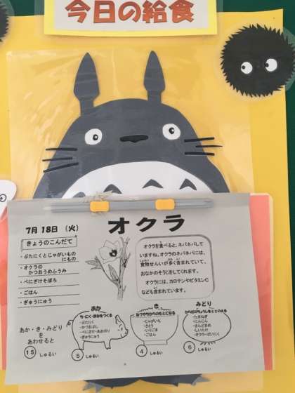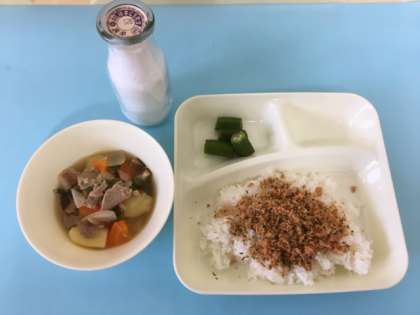 今日の給食は豚肉とじゃがいもの煮もの、オクラのかつお梅風味、紅さけそぼろ、ごはんです。オクラの梅風味はオーブンで蒸したオクラにかつおぶし、梅肉、砂糖、酢、うす口しょうゆで合わせた調味料をかけています。また紅さけそぼろはいりごまをからいりし、紅さけフレーク、料理酒、みりん、うす口しょうゆなどを加えて更にいり、仕上げに青のりを入れたふりかけです。子供達に毎回好評でご飯がすすむ一品です。