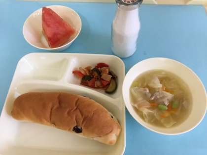 今日は1学期最後の給食でした。献立は押し麦のスープ、夏野菜とベーコンのソテー、