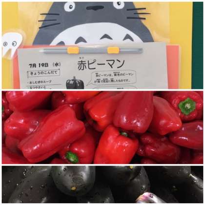すいか、レーズンパンでした。夏野菜に使用している赤ピーマンは緑ピーマンが畑で