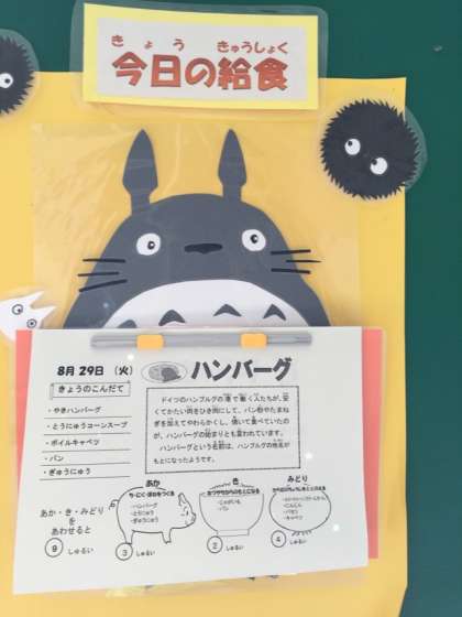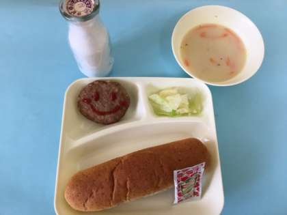 今日の給食は焼きハンバーグ、豆乳コーンスープ、ボイルキャベツ、ライ麦パンです。