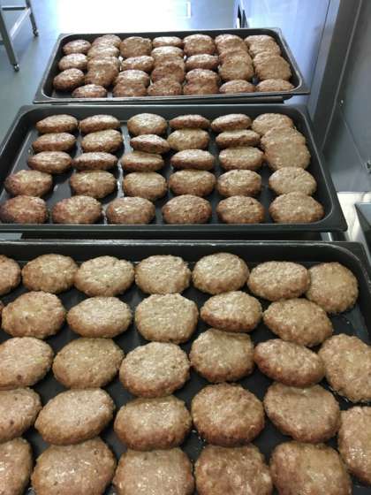 製品のハンバーグをオーブンでこんがり焼き、ケチャップをかけていただきます。またコーンスープは牛乳アレルギーの児童も喫食できるよう仕上げに豆乳を使用しています。どれもパンによく合う献立です。