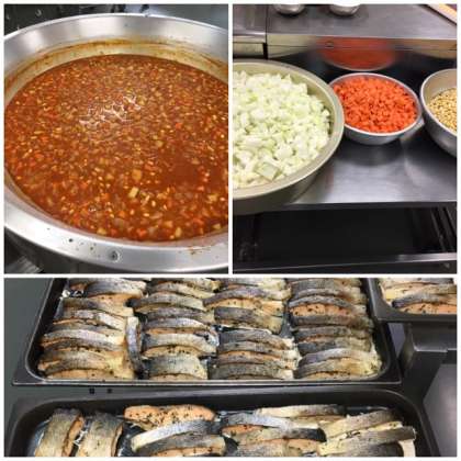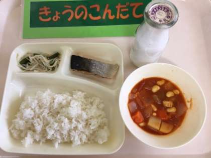 今日の給食は「さけのバジル焼き、大豆とゴロゴロ野菜のトマト煮、三度豆ともやしのサラダ、ごはん」です。この献立は平成28年度学校給食献立コンクール優秀賞をもとにした献立です。「魚、大豆、野菜を使った洋風の健康メニューを考え、ごはんに合うよう味付け、組み合わせを工夫した」と言うのがねらいです。大豆や魚は苦手な子が多いのですがトマト味やバジル風味が好評だったようでおいしいとモリモリ食べていましたよ。