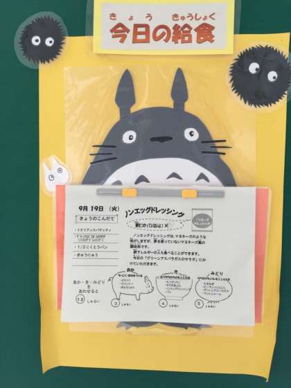 イタリアンスパゲッティは豚肉、ウインナーを主材にしたケチャップ味のスパゲッティです。またサラダにはオーブンで蒸したグリーンアスパラガスを卵アレルギーの子ども達も食べる事ごできるノンエッグドレッシングをかけていただきます。