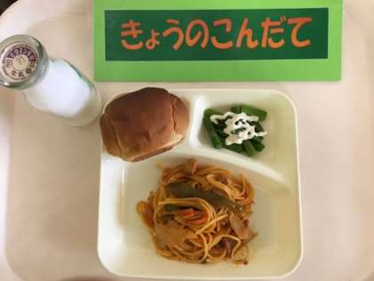 今日の給食は「イタリアンスパゲッティ、グリーンアスパラガスのサラダ、1/2黒糖パン」です。