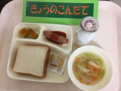 今日の給食は「フランクフルトのケチャップソース、スープ、焼きかぼちゃ、食パン」です。