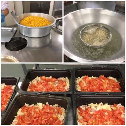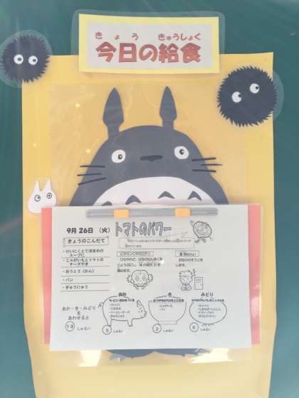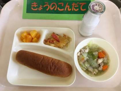 スープ煮に使用するてぼ豆には食物繊維と鉄が豊富に含まれています。また塩コショウしたじゃがいもとベーコンにトマトをのせ、上からチーズをかけてオーブンでこんがり焼いたチーズ焼きは子供達に大人気でどのクラスもからっぽになっていました。