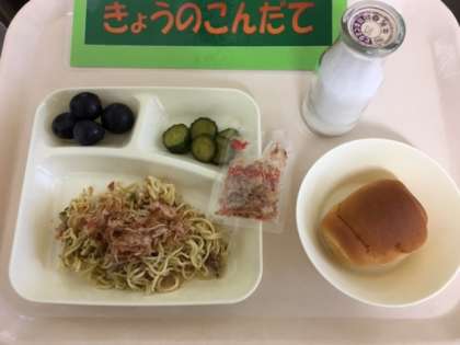 今日の給食は「和風焼きそば、きゅうりの辛みづけ、巨峰、1/2黒糖パン」です。和風焼きそばはしょうゆ味でかつおぶしをかけていただきます。