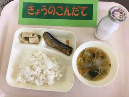 今日の給食は「さんまのさんしょう焼き、すまし汁、高野どうふの煮もの、ごはん」です。