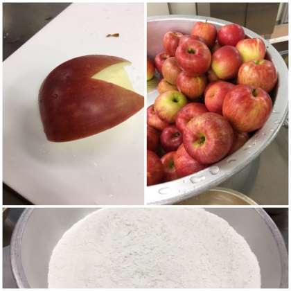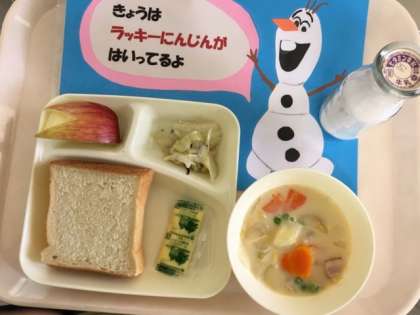 今日の給食は「コーンクリームシチュー、キャベツのひじきドレッシング、りんご、食パン」です。シチューには小麦アレルギーのある子ども達も食べられるように、上新粉を使用しています。給食では上新粉はういろうを作るときにも使用します。もちろんラッキー人参入りです。