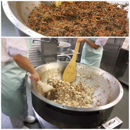きんぴらちらしは牛肉、ごぼうを主材に、にんじん、グリーンピースを使って彩りを良くし、粉末こんぶを加えて旨味も増すようにしています。桃陽小学校の給食では炊き上がったご飯と具を大きな釜で混ぜ合わせています。食べる時にきざみのりをかけていただきます。