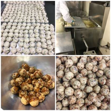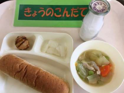 今日の給食は粉モン第2弾の「たこボール、洋風煮、だいこんのピクルス、ライ麦パン」です。たこボールは子どもたちに大人気の献立です。今回も食物アレルギーのある子どもに配慮し、卵は使用していません。たこ、とうふ、小麦粉、でんぷん、かつおぶし、青ねぎ、塩をよく練り、一つずつ丸めて油で揚げます。仕上げに手作りのソースをかけていただきます。もっとおかわりしたかったーと残念そうな声もちらほら聞こえてきました。