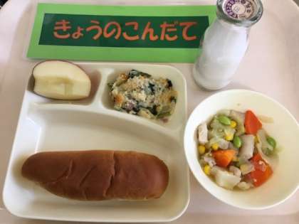 今日の給食は「スープ煮、ほうれん草のグラタン、りんご、黒糖パン」です。