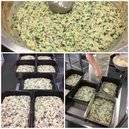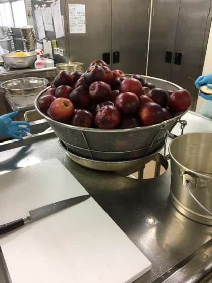 グラタンは毎回大人気の献立で、冬に旬をむかえるほうれん草、ベーコンの他、ホワイトソースがよくからむようにホイールのマカロニを使用しています。 デザートにはりんごがでました。甘くてとても美味しかったです。