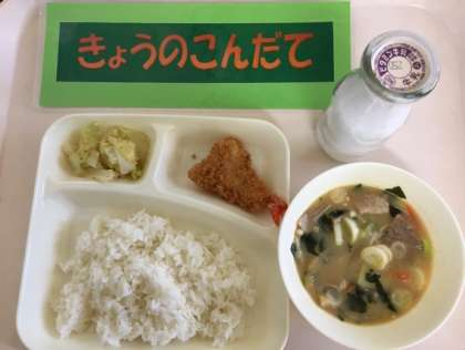 今日の給食は「えびフライ、豚汁、キャベツのかつお梅風味、ごはん」です。