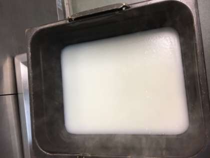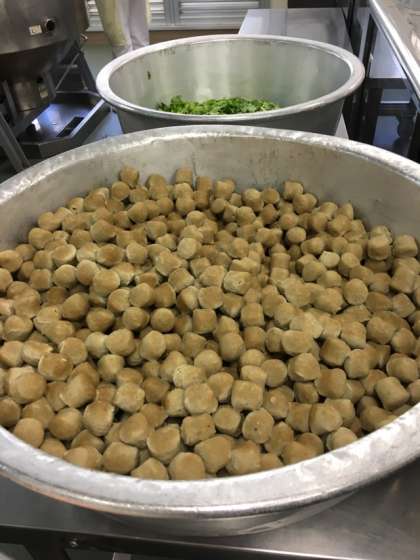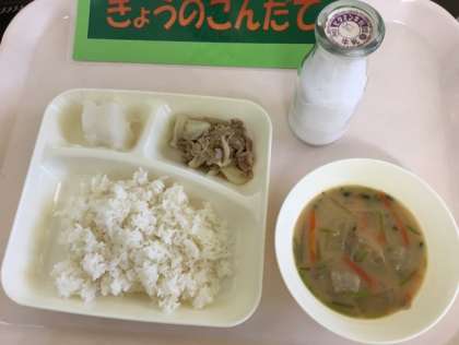 今日の給食は「豚肉とまいたけのいためもの、つみれ汁、ういろう、ごはん」です。つみれ汁はしょうが汁、料理酒で下味をつけたイワシだんごと、大根、ごぼう、にんじん、青みにみつばを使っています。デザートには上新粉、砂糖、水を合わせ、オーブンで蒸し焼きにしたういろうが登場しました。