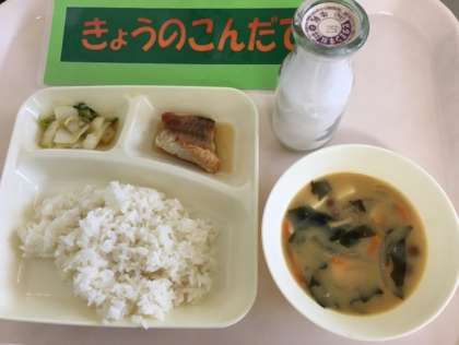 今日の給食は「赤魚のしょうゆだれかけ、なめこのみそ汁、はくさいのごまあえ、ごはん」です。赤魚は骨が少なく子どもたちにも食べやすいと人気があります。また、みそ汁には水煮の「なめこ」が登場し、キノコは苦手だけどこれは美味しいと言っている子もいました。今日の「おおさかしろなのごまあえ」は先月の台風の影響で供給できなくなり「はくさいのごまあえ」に変更になりました。