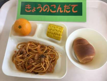 今日の給食は「きのこスパゲッティ、焼きとうもろこし、みかん、1/2黒糖パン」です。3種類のきのこを使用したトマト味のスパゲッティは子どもたちに大人気です。焼きとうもろこしは前歯の生え変わる低学年の子は食べ辛そうでしたが甘くて美味しいと好評でした。