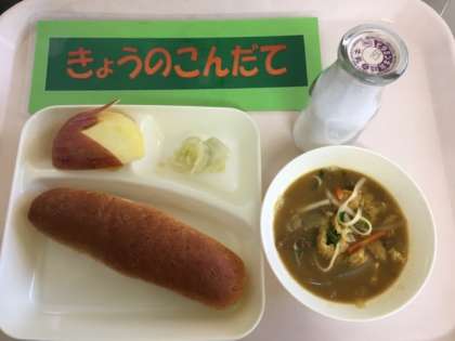 今日の給食は「カレーうどん、はくさいの甘酢あえ、りんご、ライ麦パン」です。「カレーうどん」は牛肉、野菜を炒め、昆布とけずりぶしでとっただしを加えて煮、カレールウの素、塩、こい口しょうゆで味付けした寒い時期に体の温まる一品です。デザートには山形県産の「サンふじ」が届きました。蜜がまわっていてとても美味しかったです。