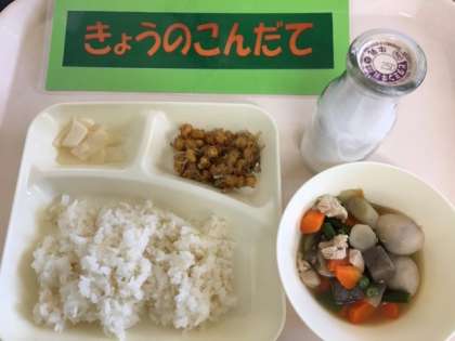 今日の給食は「鶏肉と野菜の煮もの、じゃこ豆、かぶのゆず風味、ごはん」です。