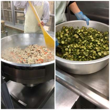 今日の給食は「筑前煮、ひじき豆、きゅうりのかつお梅風味、ごはん」です。ひじき豆はでんぷんをまぶし、油であげた大豆にひじきが入ったタレをからませます。鉄や食物繊維を多く含み、かみごたえを感じてもらい子どもたちによくかんでもらいたい献立です。