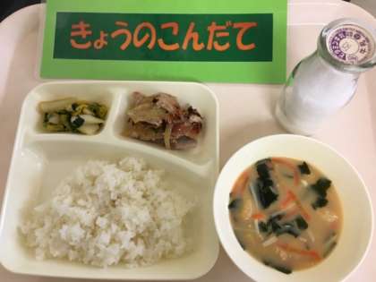 今日の給食は「豚肉のごまだれ焼き、みそ汁、きくなとはくさいのおひたし、ごはん」です。