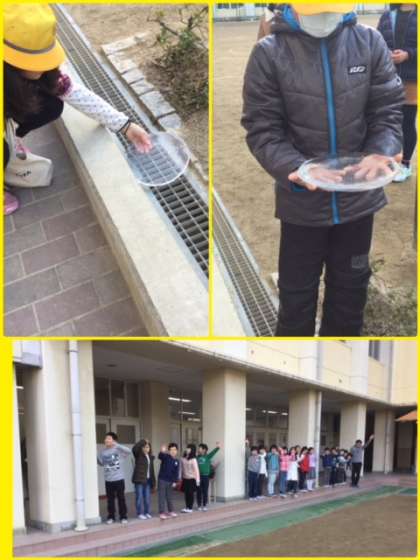 通学路の途中、バケツの中に氷を見つけた子がいました。