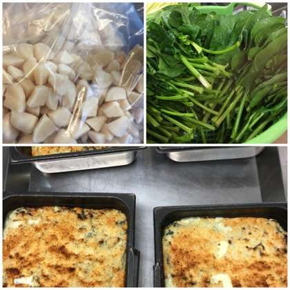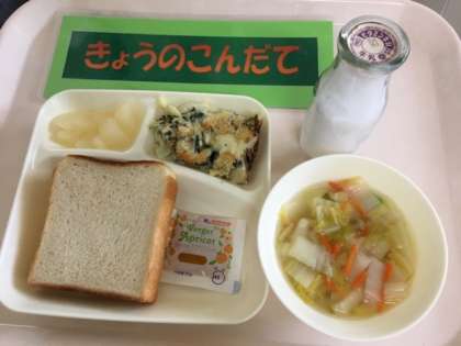今日の給食は「ほたて貝のグラタン、スープ、和なし缶、食パン、アプリコットジャム」です。ほたて貝を主材に、旬のほうれん草を使用したホワイトソースのグラタンは子どもたちの大好きな献立です。デザートには珍しい和なしの缶詰もとてもおいしくいただきました。