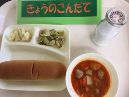 今日の給食は「ミートボールと野菜のケチャップ煮、ツナと野菜のソテー、カリフラワーのレモン風味サラダ、黒糖パン」です。肉団子を主材にしたケチャップ煮はじゃがいも、玉ねぎ、人参、むき枝豆を加えたボリュームのある煮込み料理です。また旬のカリフラワーはレモンの酸味をきかせた手作りドレッシングで和えています。給食で使用するレモンは国産のため、1月と2月だけ登場します。