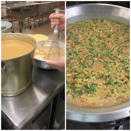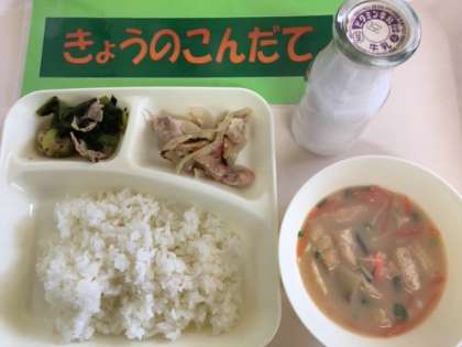 今日の給食は「鶏肉のゆず塩焼き、みそ汁、こまつなの煮びたし、ごはん」です。鶏肉のゆず塩焼きは鶏肉と玉ねぎに塩、ゆず果汁で下味をつけてオーブンで焼き上げます。ゆず風味が食欲をそそる一品です。さつまいもが入ったみそ汁は、ほんのり甘くて子供たちにも大人気でした。