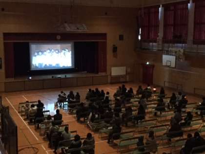 2月17日の学習参観の機会に、体育館で近畿音楽教育研究大会で発表した「カンターレ!あかんたーれ」のビデオを上映しました。