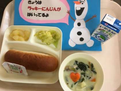 今日の給食は「ほうれん草のクリームシチュー、キャベツのサラダ、洋なしカット缶詰、大型コッペパン、りんごジャム」です。ほうれん草のクリームシチューは旬のほうれん草を使用した子どもたちに大人気の献立です。小麦粉とサラダ油でホワイトルウを手作りし、クリームでコクを出しています。今日はハート型のラッキーにんじん入り。調理員さんの愛情がたくさん入っていますよ。