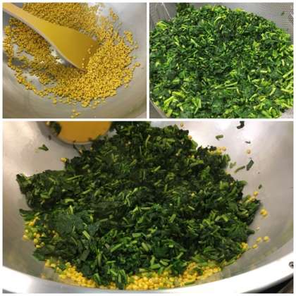 今日の給食は「豚肉と野菜のカレー煮、ほうれん草のソテー、あげポテトもち、レーズンパン」です。