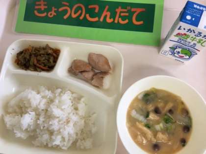 今日の給食は、「鶏肉のしょうゆバター焼き、みそ汁、きんぴらごぼう、ごはん」です。